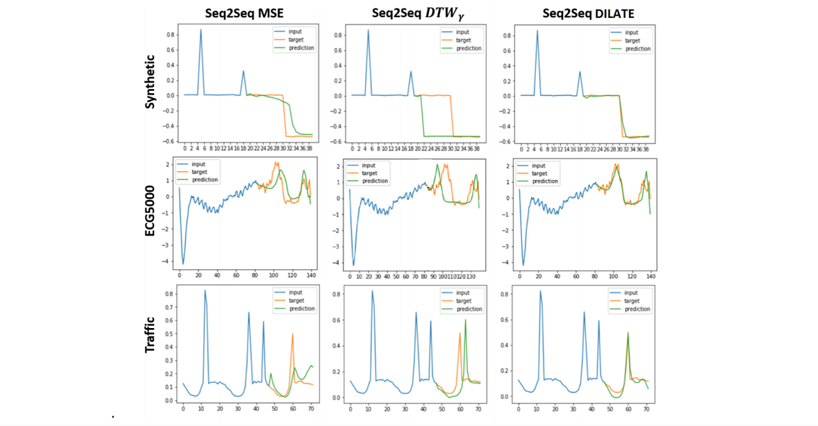 - Shape and Time Distortion Loss for Training Deep Time Series Forecasting Models by Le Guen et al. proposes DILATE, a (differentiable) objective that is a linear combination of a DTW-based term and a term to measure how far the optimal DTW warping path matrix is from diagonal. By accounting for both matching shape-wise and matching temporally, DILATE produces promising results in multi-step time series prediction.