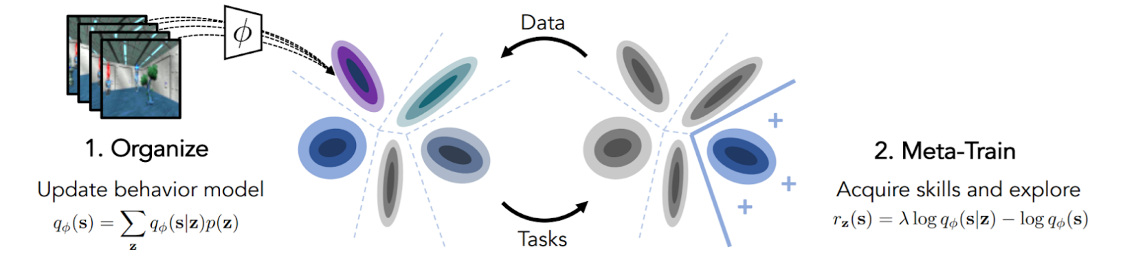 - Deciding on a good distribution of learning tasks to employ in meta-RL usually requires a strong human prior. Unsupervised Curricula for Visual Meta-Reinforcement Learning by Jabri et al. (CARML) attempts to remove this constraint by learning a useful task distribution via variational expectation-maximization of the mutual information between the learner’s data distribution and the distribution induced by a latent task variable.